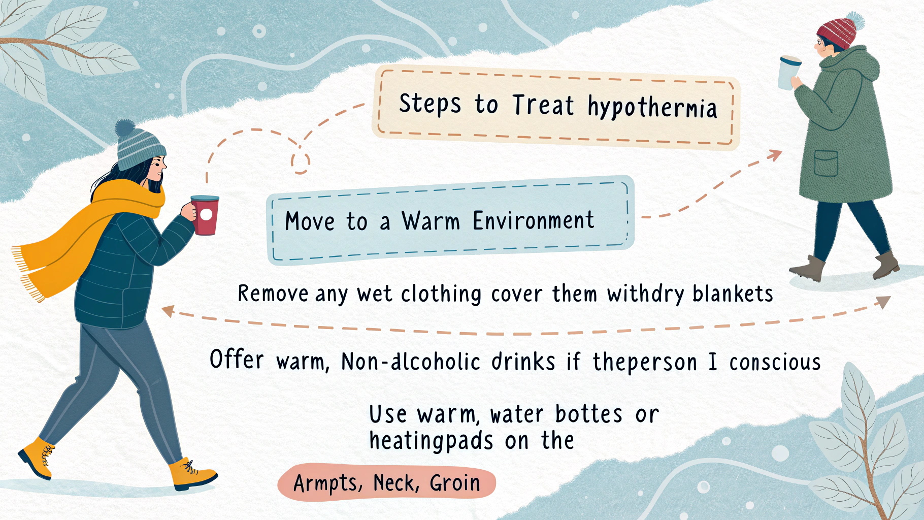 - Do not warm their arms, hands, or legs. Heating or massaging limbs in this situation is harmful to the heart and lungs and can cause more serious health problems..